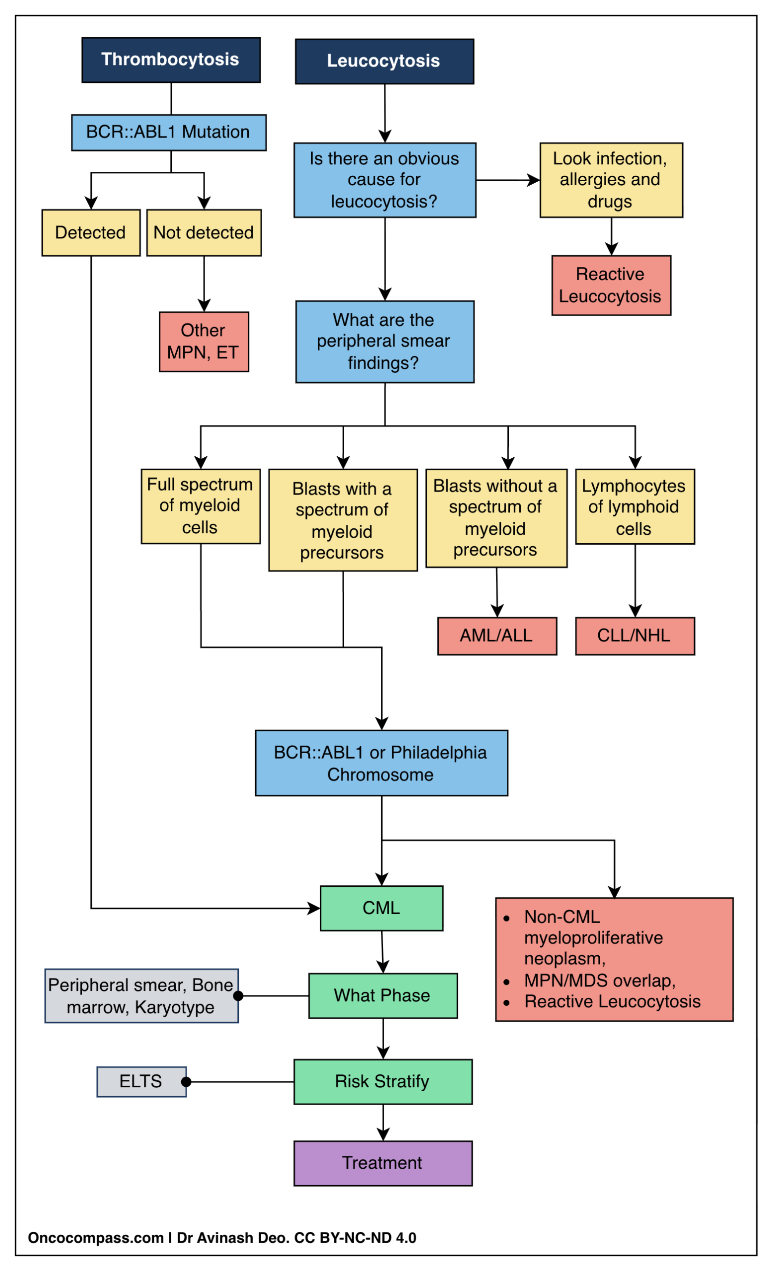 CML usually presents as leucocytosis but rarely may present as isolated thrombocytosis. The diagnostic workup for a suspected case of CML follows a sequential pathway answering six key questions: