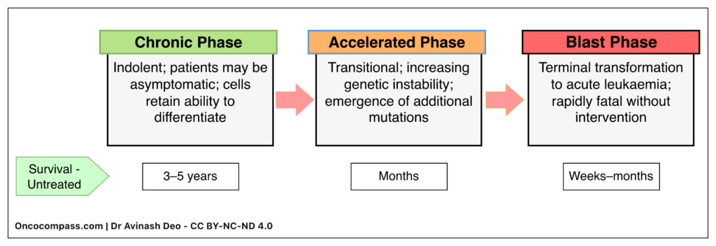 Untreated, CML follows a predictable clinical course through distinct phases: